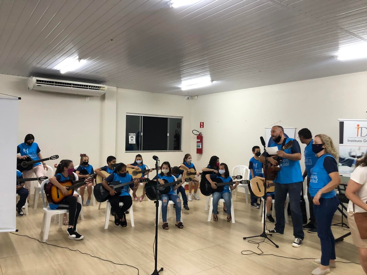 Crianças e adolescentes do Projeto Música Social realizam apresentação.